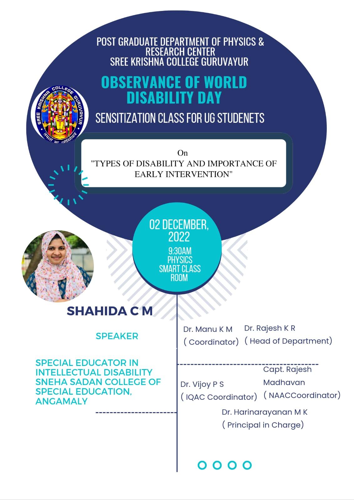 The Department of Physics organized a sensitization class as a part of Observance of World Disability Day. The topic was "Types of Disability and Importance of Early Intervention". The resource person was Ms. Shahida C. ...