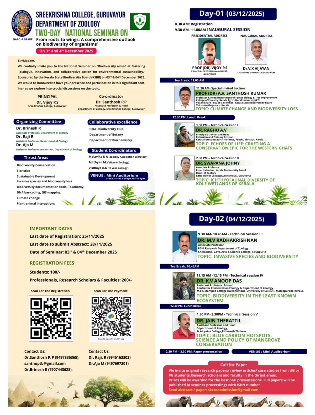 The Department of Zoology, Sree Krishna College, Guruvayur, organised a Two-Day National Seminar titled “From Roots to Wings: A Comprehensive Outlook on the Biodiversity of Organisms.” The seminar focused on ...